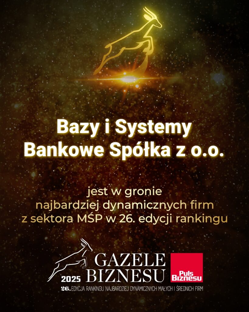 Z radością informujemy, że firma Bazy i Systemy Bankowe Spółka z o.o. znalazła się w prestiżowym gronie Gazel Biznesu 2025 – najbardziej dynamicznych polskich przedsiębiorstw z sektora MŚP, w ramach jubileuszowej 26. edycji tego rankingu. To ogromne wyróżnienie dla naszej firmy, które świadczy o jej dynamicznym rozwoju oraz solidnym zarządzaniu.