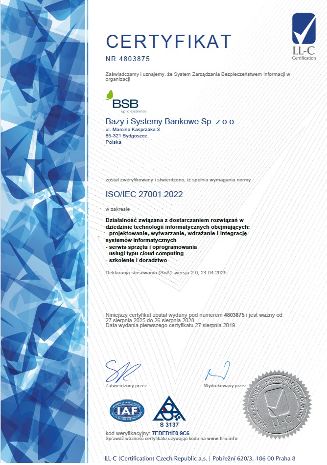 W naszej firmie stawiamy na najwyższe standardy zarówno w zakresie jakości, jak i bezpieczeństwa informacji. Posiadane certyfikaty PN-ISO/IEC 9001:2015 oraz PN-ISO/IEC 27001:2022 są dowodem na nasze zaangażowanie w ciągłe doskonalenie procesów i ochronę danych, co przekłada się na pełne zaufanie naszych klientów.
